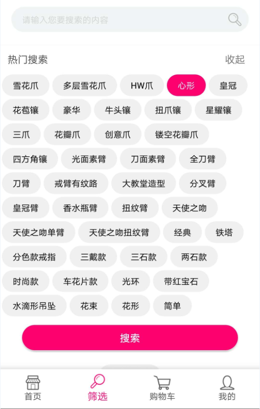 大家在底部”筛选”中,从“热门搜索”中选中“心形”,点击搜索即可看到所有的心形戒指。